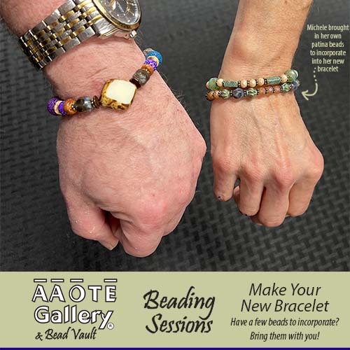 This class will include the supplies and instructions needed to make one beaded stretch bracelet from a lovely assortment of beads, a bottled water, and good vibes. Participants will have a chance to shop AAOTE Gallery either before or after their class (depending on class time in accordance with AAOTE Gallery hours).